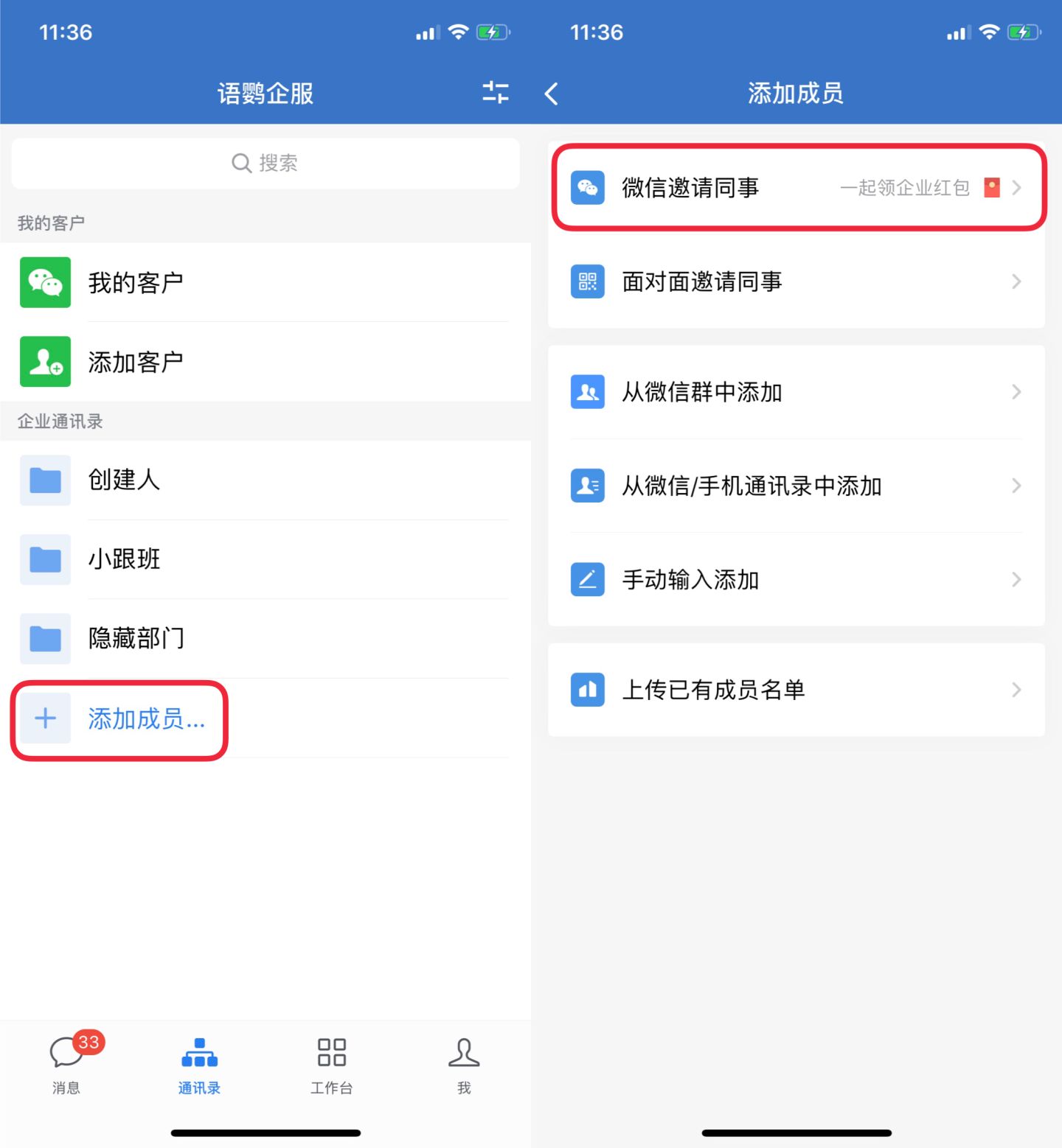 在手机上打开企业微信App,点击底部的通讯录,看到「添加成员」按钮进入,再点击「微信邀请同事」,即可邀请新同事加入领红包。