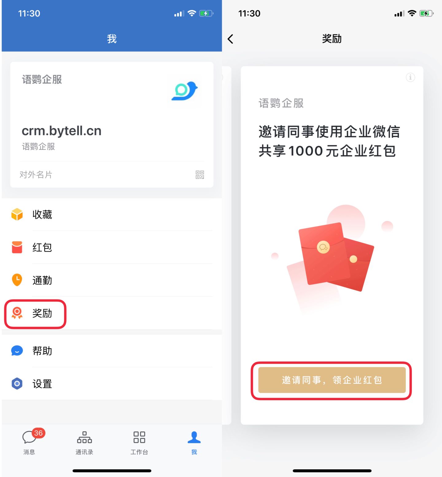 在手机上打开企业微信App,点击底部“我”进入个人主页,找到「奖励」入口,并点击进入,即可「邀请同事,领企业红包」。