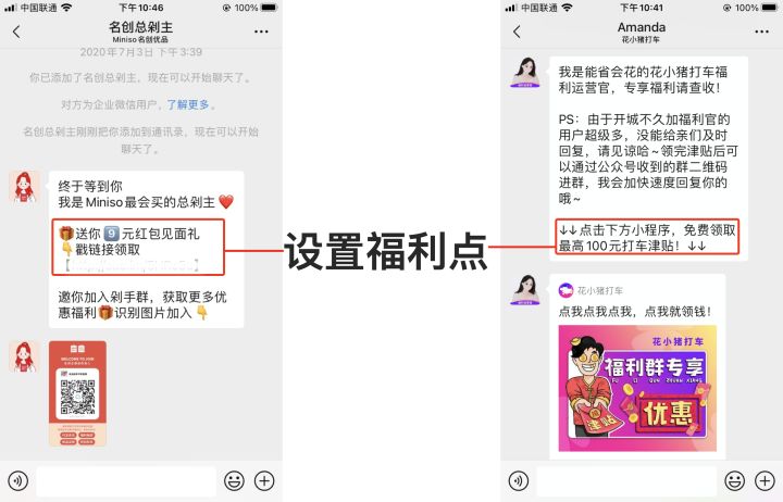 如图Miniso名创优品和花小猪打车的欢迎语,就给首次添加的客户赠送里见面礼和打车津贴。