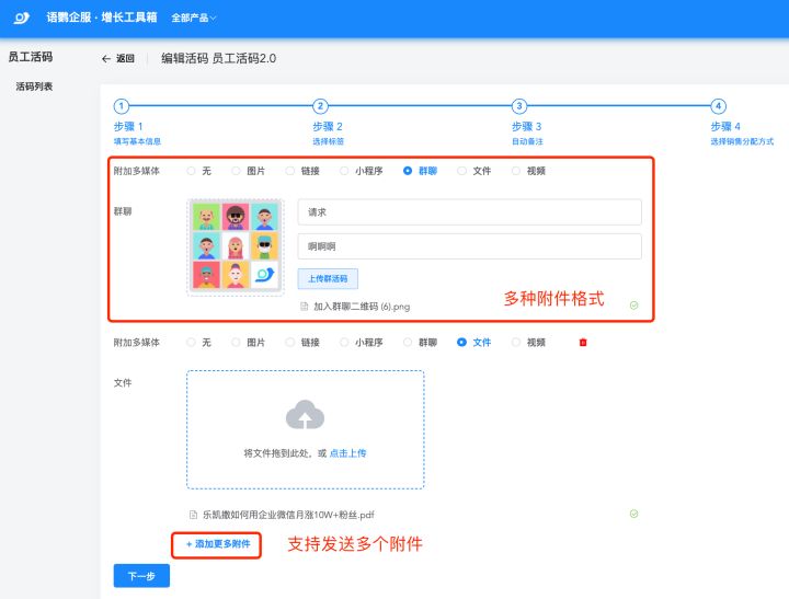 无论是设置福利点、交流点、留存点还是行动点,在企业微信欢迎语中都支持多种格式文件,借助语鹦企服「员工活码」功能,还可给不同渠道设置不同的欢迎语,并支持插入文本、网页、图片、小程序、群聊、视频、文件等内容,并可实现自动拉群,一次发送多个附件等高级玩法。前往阅读→《企业微信私域运营从入门到精通》百科全书