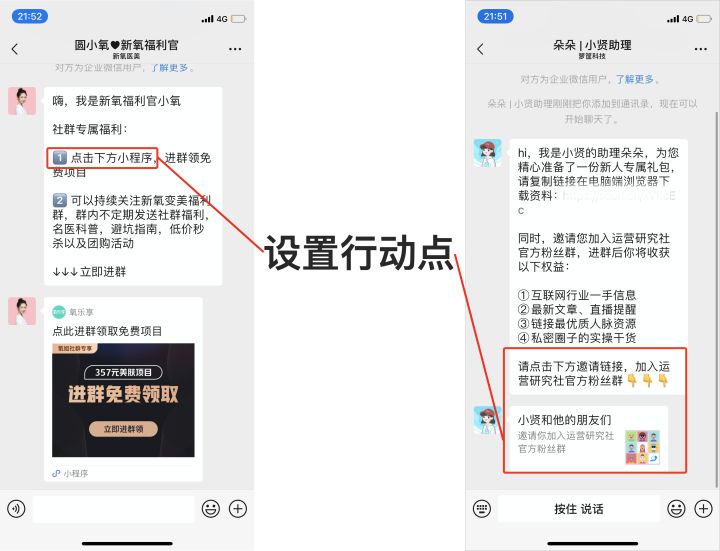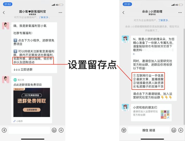 除了在欢迎语发送领取优惠券等福利以外,一般还会通过欢迎语引导用户进群,增加留存率和减少私聊对用户的强打扰,相对创造一个弱打扰强留存的空间来做信息分发,或引导客户回复特定的动作/消息与企业产生初次互动。