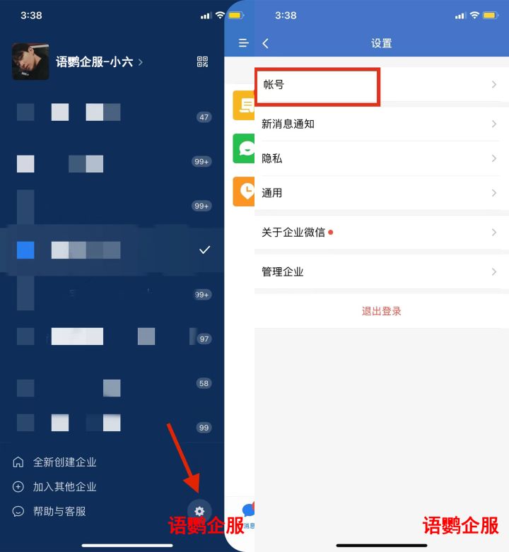 1.在企业微信App消息页面,左滑进入如图页面并点击右下角的设置,点击帐号