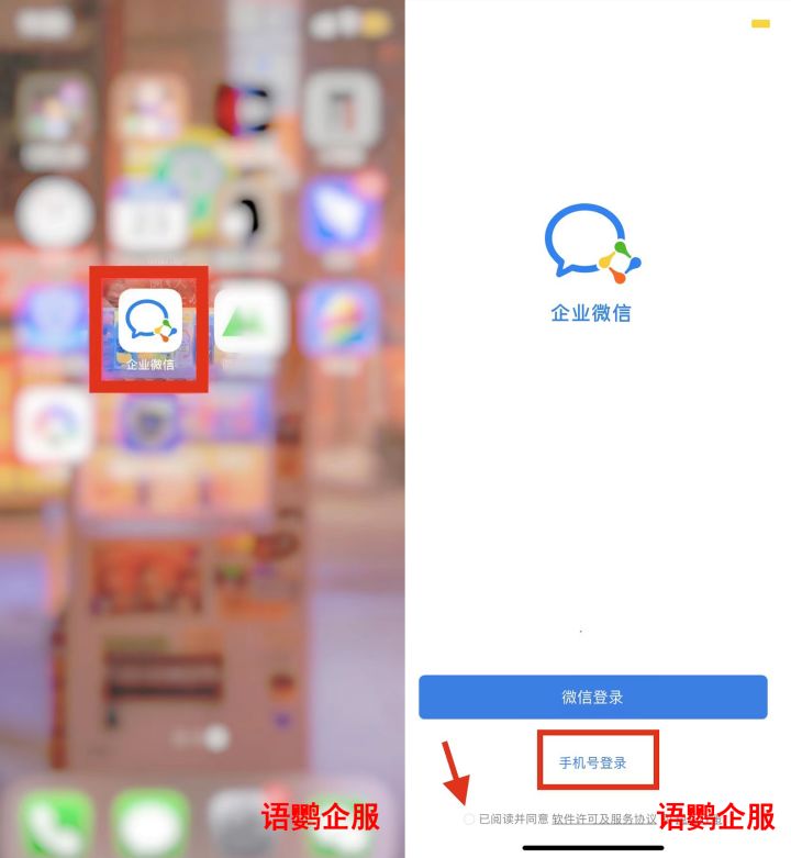 1.下载并打开4.0.0版企业微信,出现以下页面后,点击手机号登录,记得勾选已阅读哦