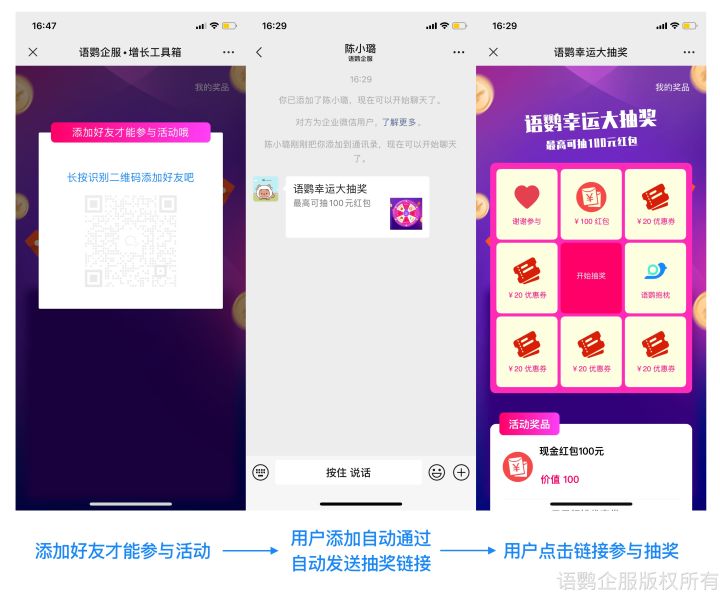 在微信发起进群抽奖活动,利用语鹦工具箱【抽奖-转盘/九宫格】功能提前设置好活动规则,当客户扫码参加抽奖时,必须先进群才可以抽奖,这样就可以将客户巧妙添加到我们企业微信上。