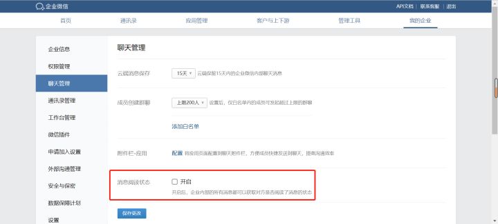 我们也可以在企业微信电脑端关闭已读功能,登录后台后,【我的企业】中【聊天管理】界面里,打开【消息阅读状态】即可进行设置。 如下图红色框中内容,不选中【消息阅读状态】中【开启】按钮即可。