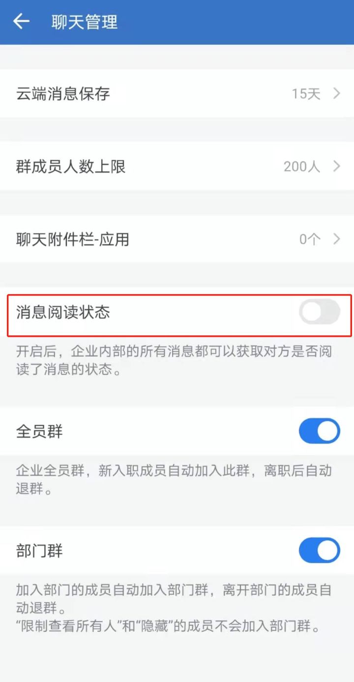 在手机端,点击【工作台】中的【管理企业】,选择【聊天管理】-【消息阅读状态】即可关闭消息已读功能。 如下图红色框中内容,不选中【消息阅读状态】中【开启】按钮即可。
