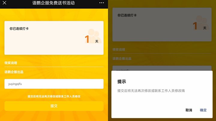 (3)当企业活动的奖品设置是表单时,那么用户将可以在领奖页面填写入相应表单并提交给工作人员,等待奖品发放即可。注意表单的一旦提交后只能通过联系工作人员修改,所以需要用户在填写时仔细校对。