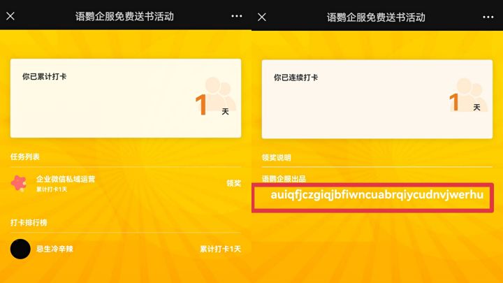 (2)当企业活动奖品设置为兑换码时,用户可以在领奖页面看到奖品专属兑换码,复制到奖品的兑换页面即可领取对应的打卡奖励。