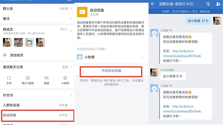 如果需要实现自动化回复,提高企业社群管理的效率,就可以结合我们企业微信机器人自动回复功能,设置自动回复功能时我们需要在群聊选择 [自动回复] – [开启自动回复] – 打开企业微信管理后台 – [客户联系] – [聊天工具] – [自动回复] 进入配置填写入打卡活动回复话术及链接即可。
