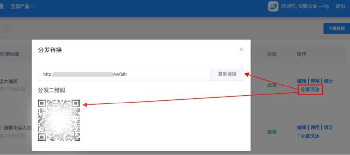 登录语鹦企服后台,企业可以创建一个大转盘抽奖活动,将活动说明、抽奖算法、奖品等信息设置完成,就可以生成活动链接或者二维码,企业可以将这个活动链接/二维码加入到群公告、欢迎语或者活动海报中,群发给客户。只要客户点击链接或者扫码二维码就可以参与到抽奖活动中。