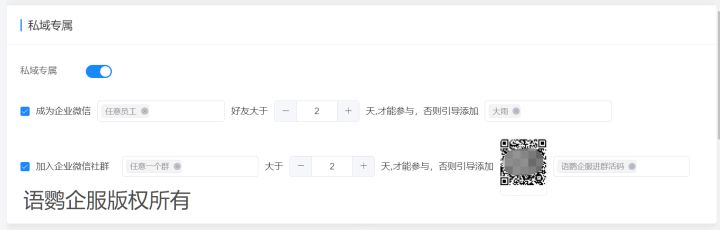 语鹦企服的大转盘抽奖功能还可以将活动限制为私域专属,限制参与抽奖的人。如果参与抽奖的用户还不是企业的微信好友或者是企微社群成员,那么他必须添加企业的企业微信或者加入企业的客户群才可以参加抽奖。