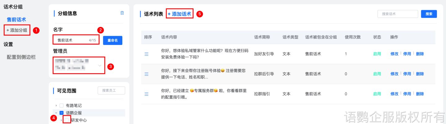 企业可以设置话术库的管理员,管理员拥有编辑话术库功能,当管理员设置好话术库后,可以选择一个话术可以共享到多个分组,语鹦企服工具箱同时支持管理员设置按部门开放可见范围或使用权限。(详情请见图4位置)