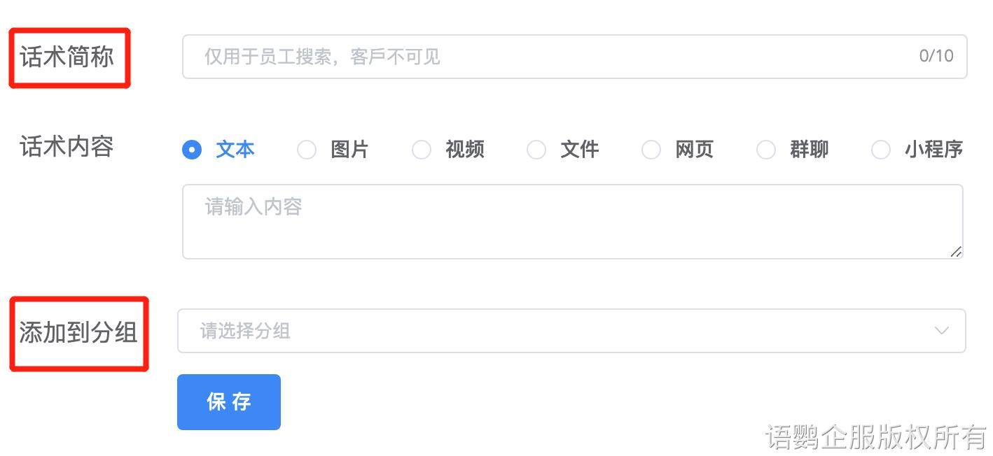 语鹦企服工具箱的话术库支持文本、图片、视频、文件、网页、链接、小程序等多种格式的自动回复,满足大部分企业的需求。