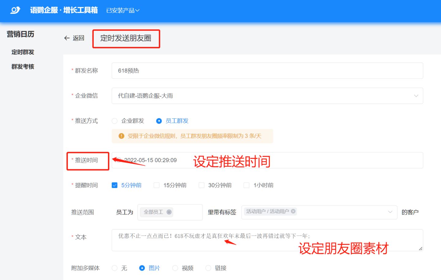 通过企业微信是没有办法直接设置自动转发朋友圈素材的,私域运营的同学如果想要自动转发朋友圈素材,可以试试语鹦企服【定时群发sop】功能,只需要设定好推送时间和朋友圈素材。员工到时间再去发布朋友圈时,系统将会把素材自动填充到朋友圈发布入口,员工不需要再花时间编辑。