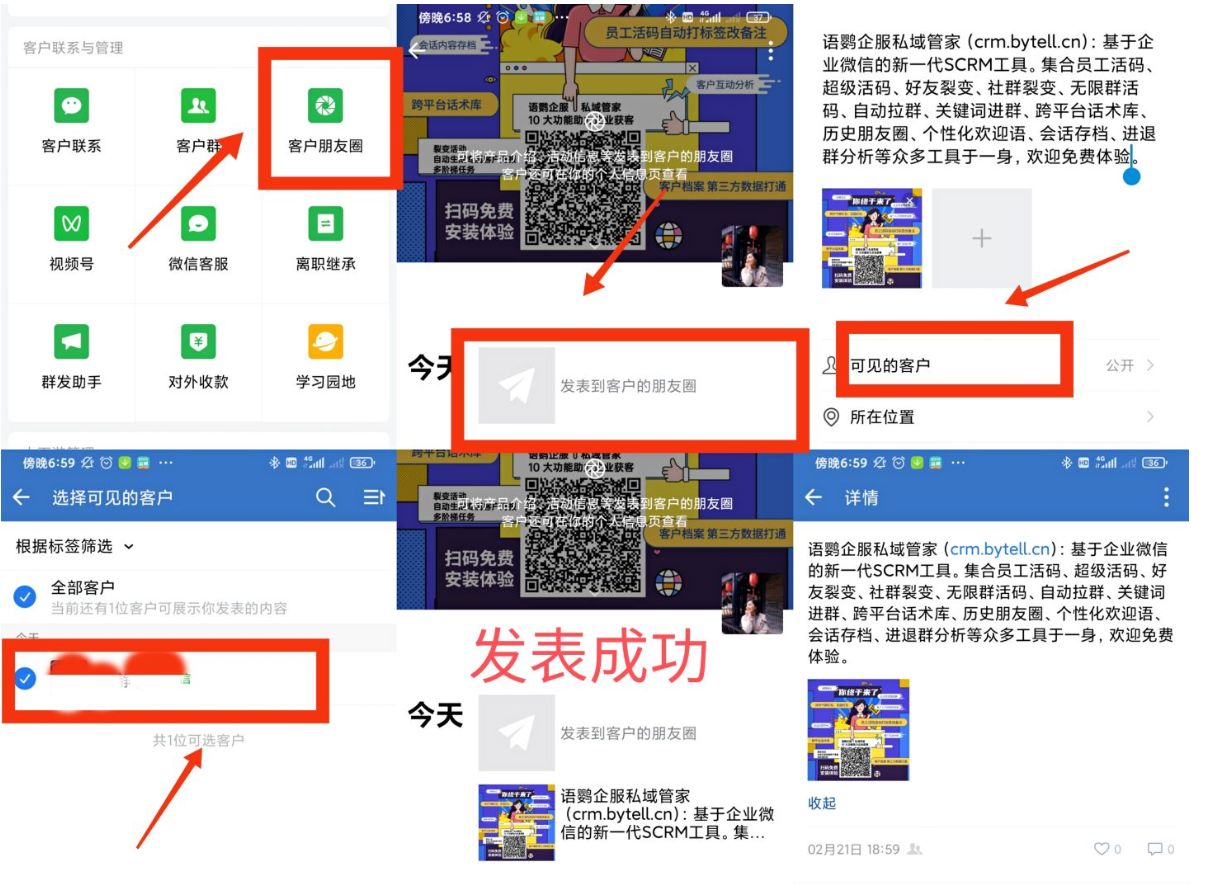常用企业微信的同学,都知道企业微信发朋友圈有两种方式:一种是由企业员工自己编辑发布。在企业微信【工作台】—【客户朋友圈】中直接编辑发布朋友圈,在群发朋友圈是可以设置可见的客户,群发给全部客户或者群发给某个标签的客户;