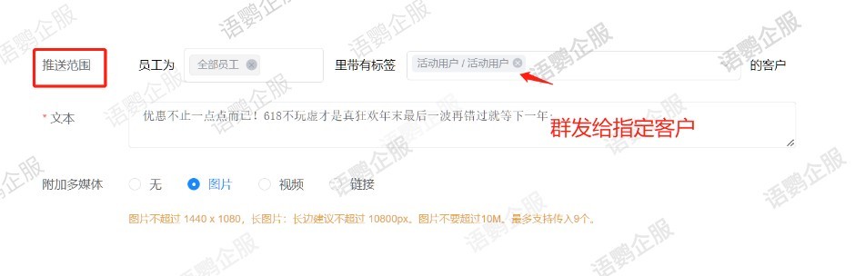 除了定时群发外,企业在设置朋友圈群发时,还可以筛选推送范围。大到群发给所有的客户,小到可以群发给某个标签下的客户,实现精细化、自动化的管理。