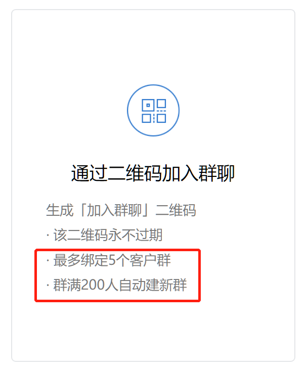 我们在企业微信创建群活码时,会发现群活码可以绑定5个客户群聊,当一个群满200人会自动建新群。也就是说一个企业微信群活码上限可以让1000个人扫码入群。