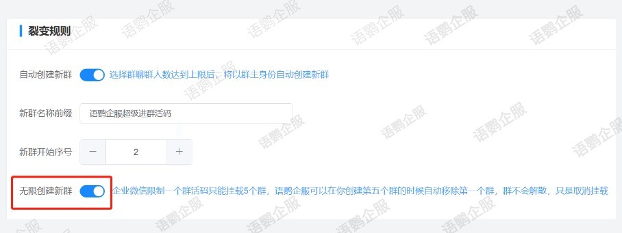 而且语鹦企服群活码功能还可以无限上创建群聊,结合自动解除关联群聊,轻松突破企业微信群活码1000人扫码进群的限制。