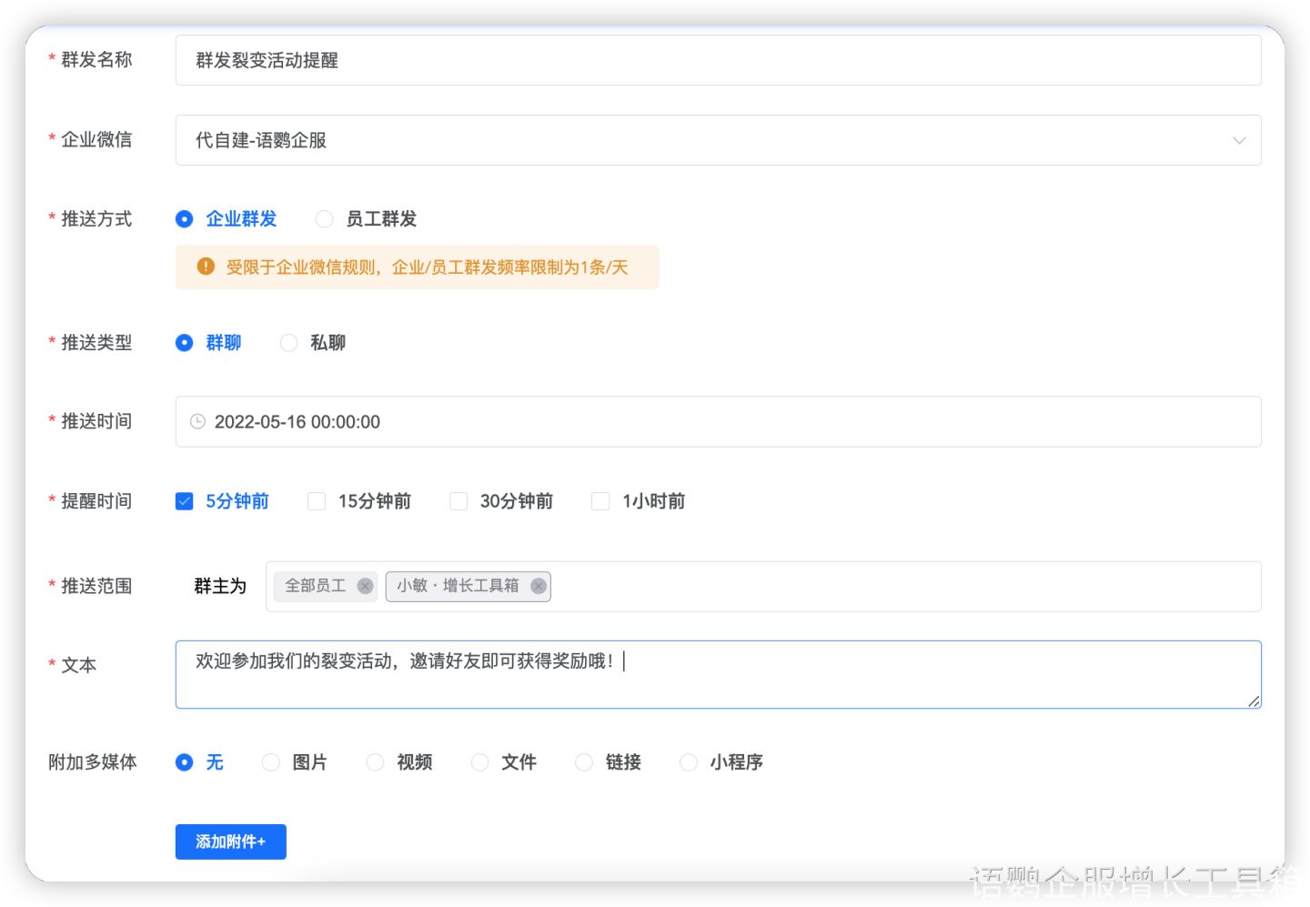 通过设置推送类型为【群聊】的任务,企业可以提醒多个或全部作为群主的员工客户群进行群聊定时发送。