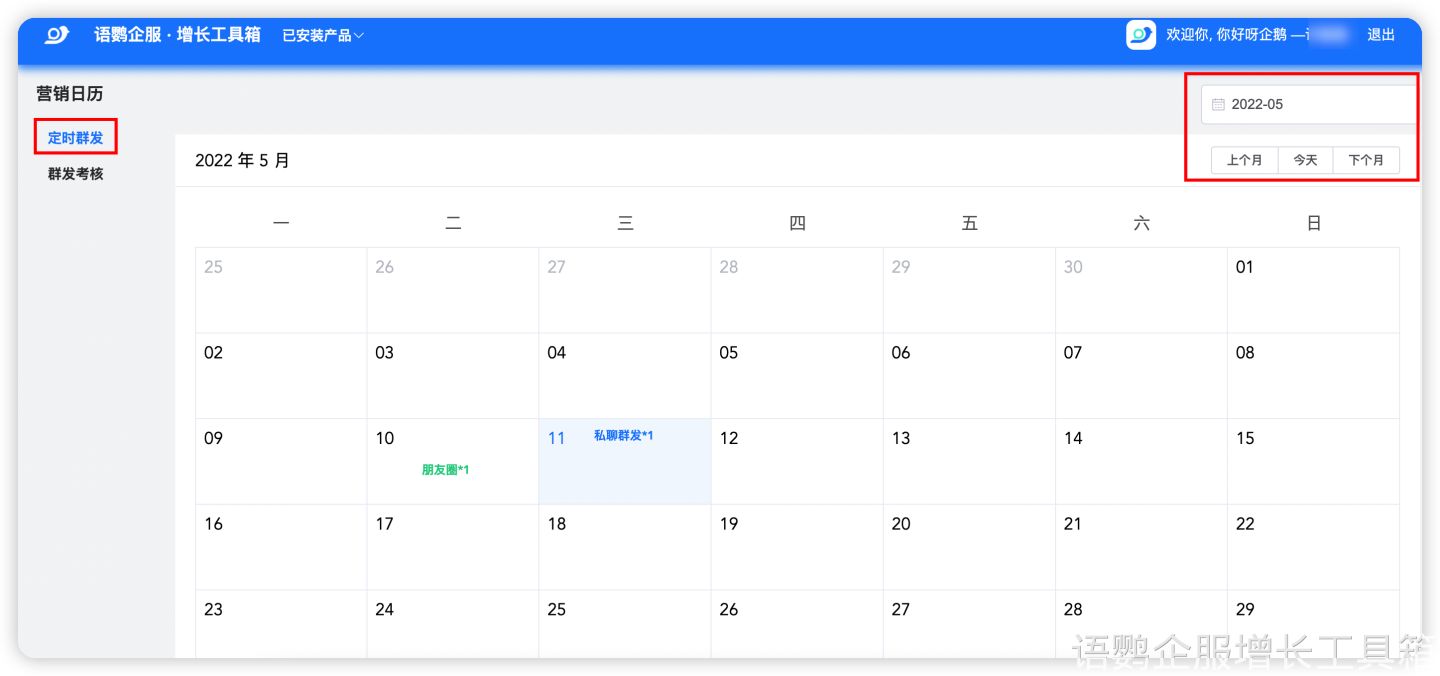 「营销日历-定时群发SOP」功能会生成一个月度的完整页面,方便企业对一整个月的营销活动清晰地统筹。点击需要设置定时群发的日期,即可新建客户群定时群发任务。