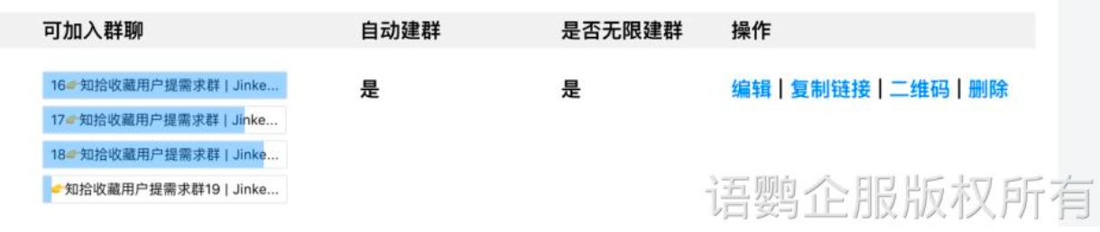 如果企业想突破群活码的关联群聊限制,可以选择语鹦企服【进群活码】功能。能够无限建群,而且一个群活码可以关联无限个客户群聊,不需要担心5个群满人后群活码失效。