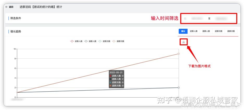 除此之外,语鹦企服的进群活码功能还会对扫描该活码的客户进退群趋势进行统计分析,方便后续复盘。