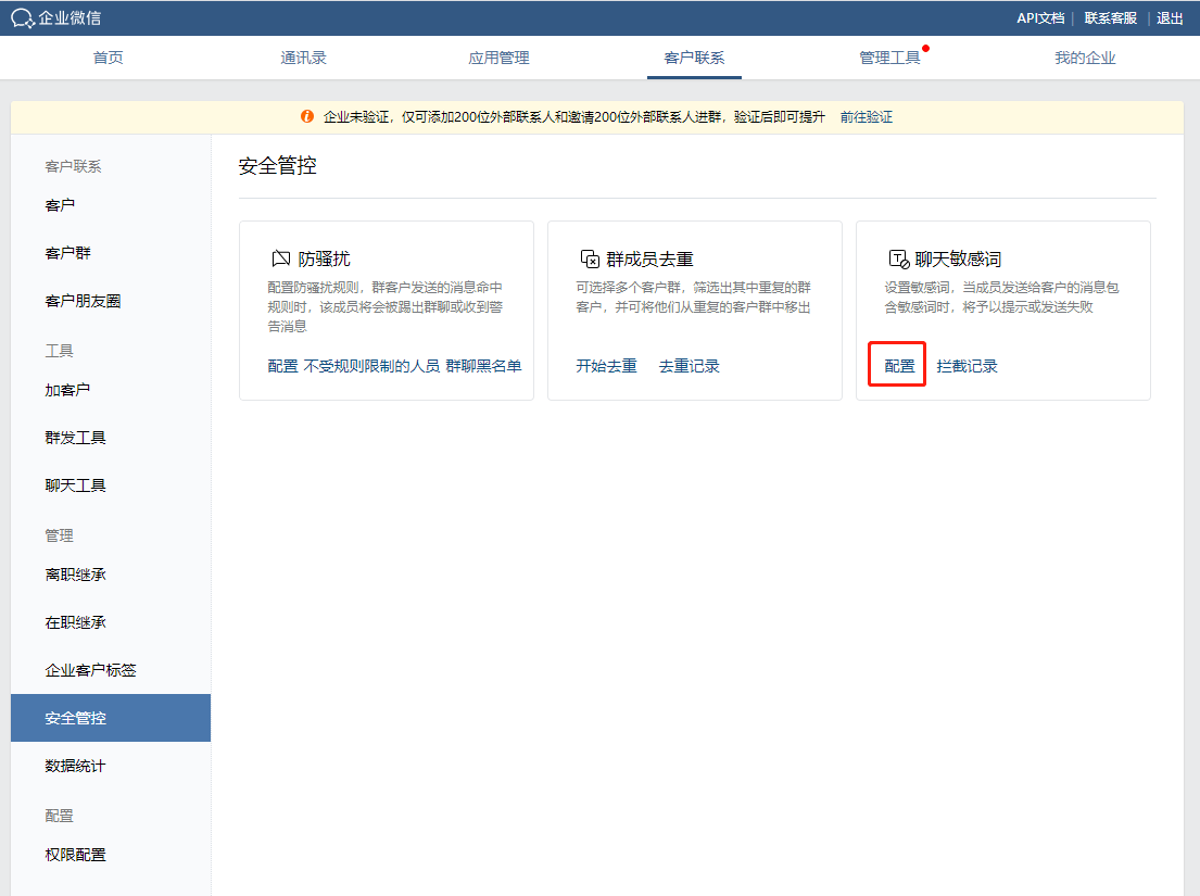 企业可通过后台设置,对敏感词进行限制发送,从而禁止员工私拉客户的行为。企业微信的【聊天敏感词】功能只能在电脑端使用,需要企业微信的超级管理员依次点击【管理端-客户联系-安全管控-聊天敏感词-设置】进行设置。