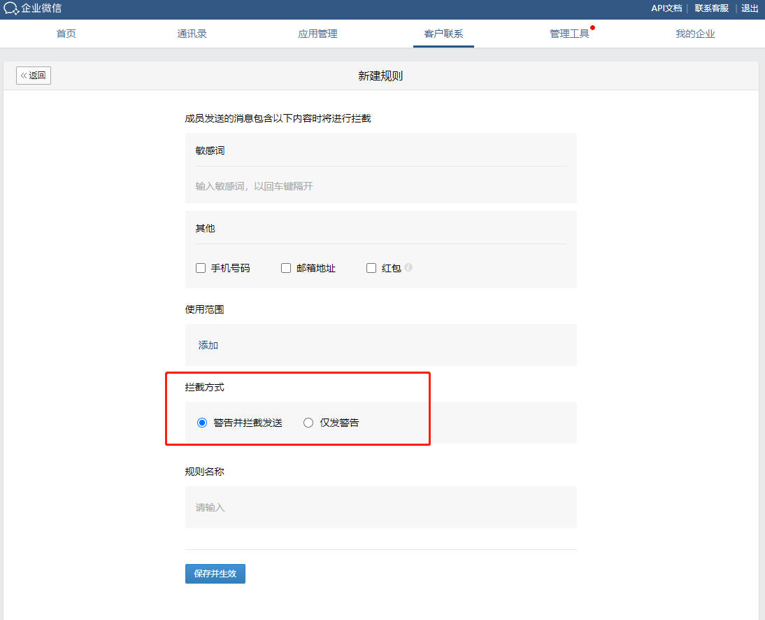 企业可以选择拦截的方式,一个是【预警并拦截发送】,一个是【仅发警告】。前者会直接拦截员工发送的信息,而后者则会在员工发送时弹出提醒,员工依旧可以选择发送。