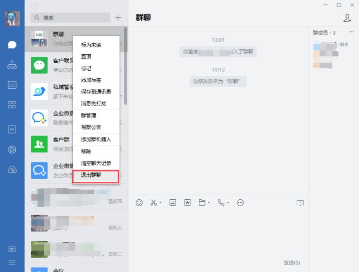 PC端的方法与APP稍有不同,首先还是打开企业微信,然后右键点击自己创建的企业微信内部群聊,然后点击「退出群聊」即可