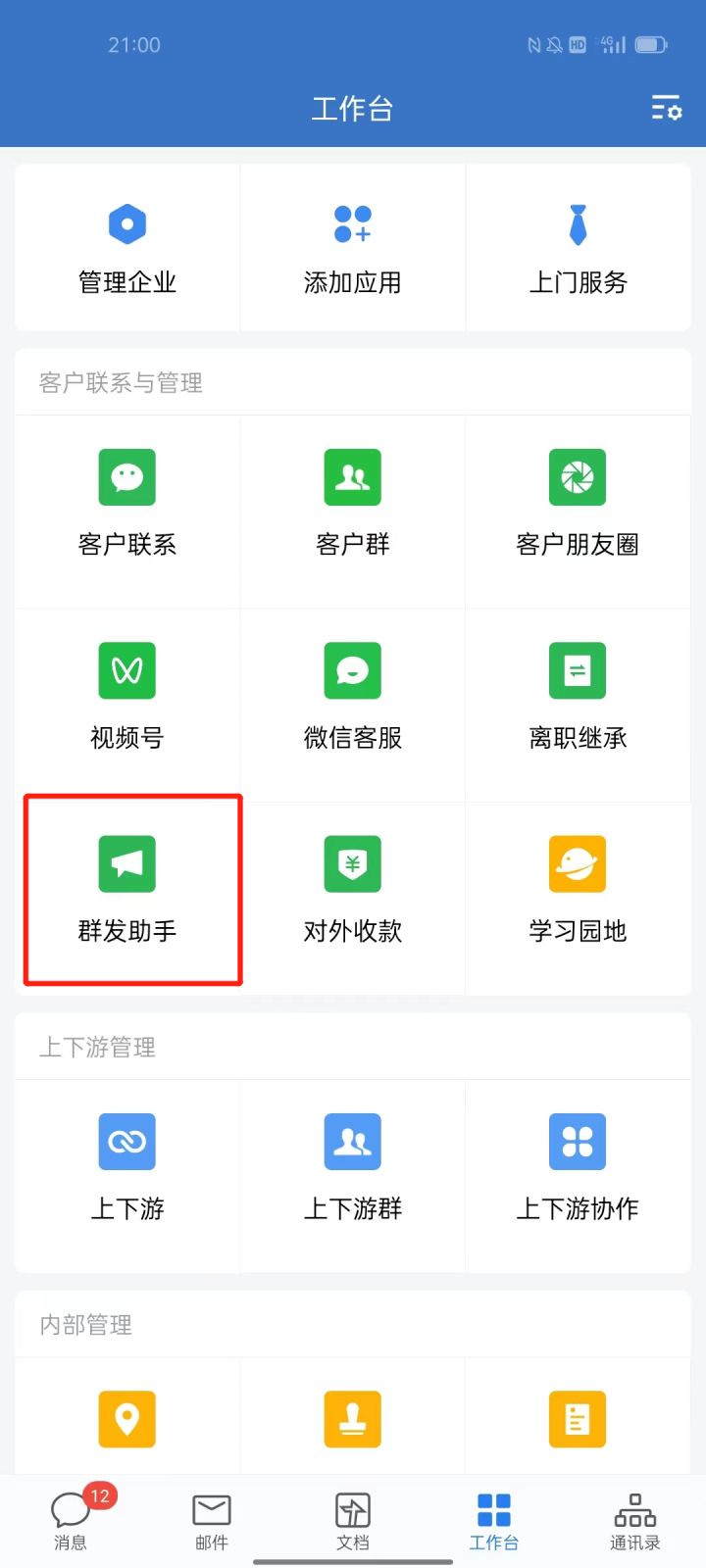 如果是员工群发,企业微信每次群发最多不能超过200人,当员工选择“全选”时,系统则会随机挑选200个客户进行群发(好消息,企业微信4.0.8版本解除了该限制,可以无限制群发人数了)。员工可以通过【工作台-群发助手】将编辑好的消息进行群发;而如果是企业群发,可以选择全部用户发送,由员工在手机端收到提醒后,一键点击发表。