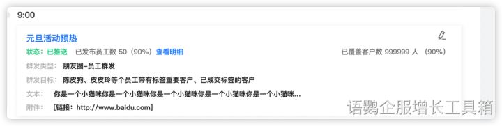 语鹦企服工具箱中的“定时群发SOP”功能,在企业微信原有的图片、文字消息基础上,新增图片、视频、文件、链接、小程序等形式,让群发形式更加多样。另外,该功能下还支持企业实时监管员工的群发情况,考核并干预员工的群发工作,有利于在有限的群发条件下最大化群发功能的效果。欢迎大家前往语鹦企服官网免费体验!