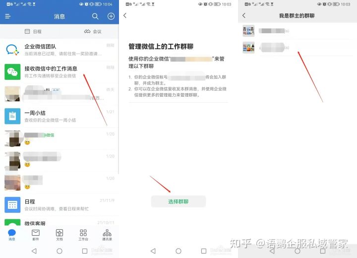 在满足以上两个条件的情况下,可以进入企业微信主页,在【消息】中,找到并依次点击【接收微信中的工作消息】-【选择群聊】-【选择需要迁移至企业微信的群聊】-【确定】,完成群聊迁移。