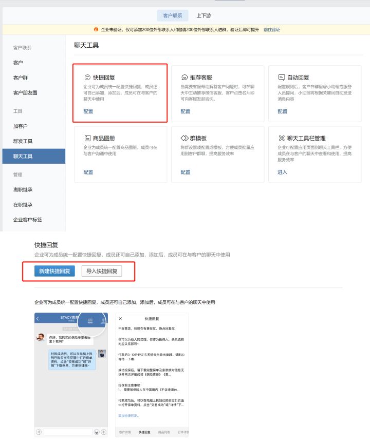 如果是企业为员工创建快捷回复,只需在管理者后台的【客户上下游】-【聊天工具】-【快捷回复】,选择【新建快捷回复】或者【导入快捷回复】直接添加内容。