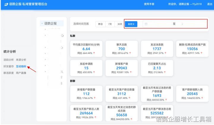 挖掘潜在客户实际上也是唤醒沉默用户的过程。借助语鹦企服工具箱的【互动指标】功能,可查看某个日期范围内,员工、部门乃至整个企业与用户的互动数据。