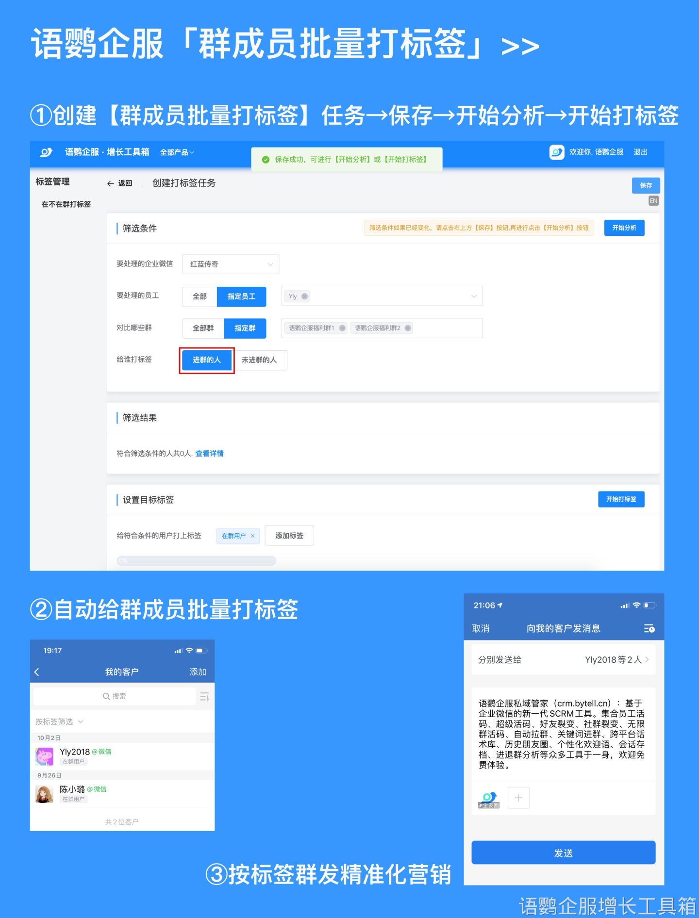 当企业想要为在群以及不在群的客户做好分类打上标签时,可以使用语鹦企服的【在群/不在群打标签】功能,创建打标签任务之后开始分析,系统就可以批量为群成员打上标签啦!