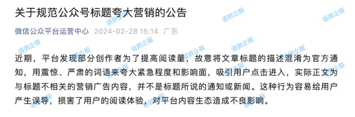2月28日,微信公众平台运营中心官方发布《关于规范公众号标题夸大营销的公告》,内容揭露了一些创作者为追求阅读量,故意误导用户的行为。创作者以夸张语言描述、仿冒官方通知的方式引导用户点击,却实际呈现与标题不符的营销广告内容。不仅误导用户,损害了阅读体验,也对平台内容生态造成了负面影响。