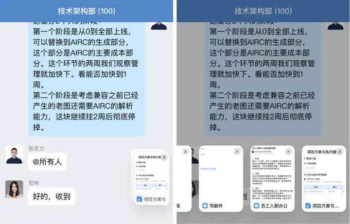 手机端支持多窗口。可打开文档、邮件、文件和网页了,处理工作更高效。(iOS: 从左侧边缘右滑至「最小化」区域、Android: 右上角「更多-最小化」)
