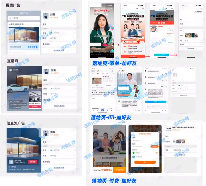 微信外应用场景包括有短视频、知识、搜索平台的广告落地页,及短信、官网和App等。