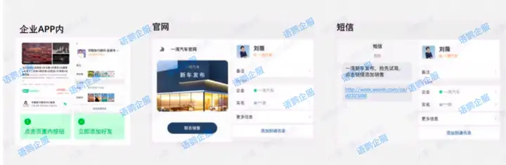 企业将「获客助手」链接配置在微信内/外的获客场景,客户点击即可添加成员的企业微信。可使用的场景包括微信内的广告、视频号、公众号、短信等;