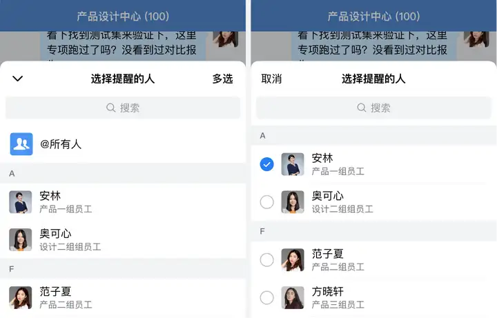 移动端@人时支持多选,同时提醒多个群成员更方便。