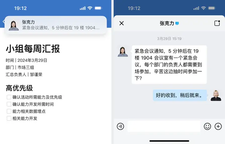 在企业微信中处理工作时,也能通过App内消息横幅及时收到新消息通知并快捷回复