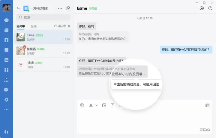 2. 微信客服支持在客户咨询消息后直接匹配展示智能辅助推荐答案,使用更方便。