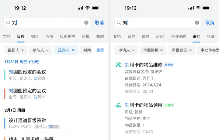 全局搜索支持查找日程和审批应用中的内容,并提供了多维度的高级筛选能力,查找日程事件、审批单更便捷。