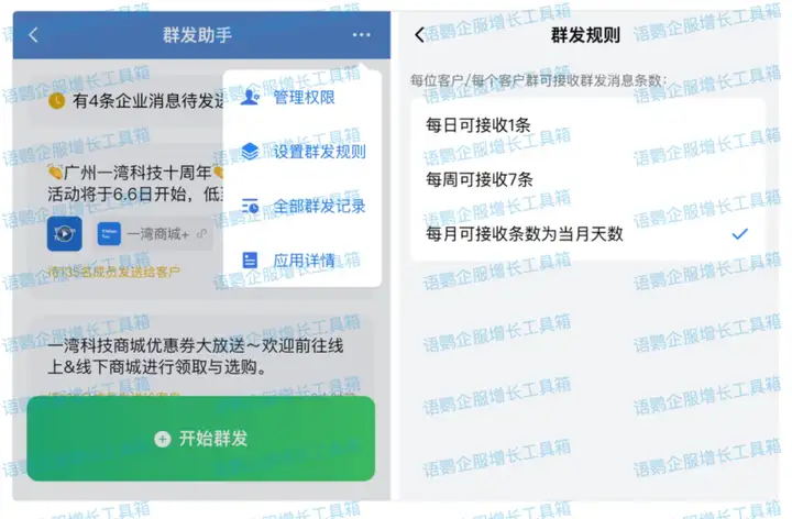 更新之后的企业微信,管理员可以在【企业微信手机App-群发助手-设置群发规则】,根据需求配置群发规则,控制每位客户或客户群每天最多接收1条消息,每周最多接收7条,或每月接收条数不超过当月天数。