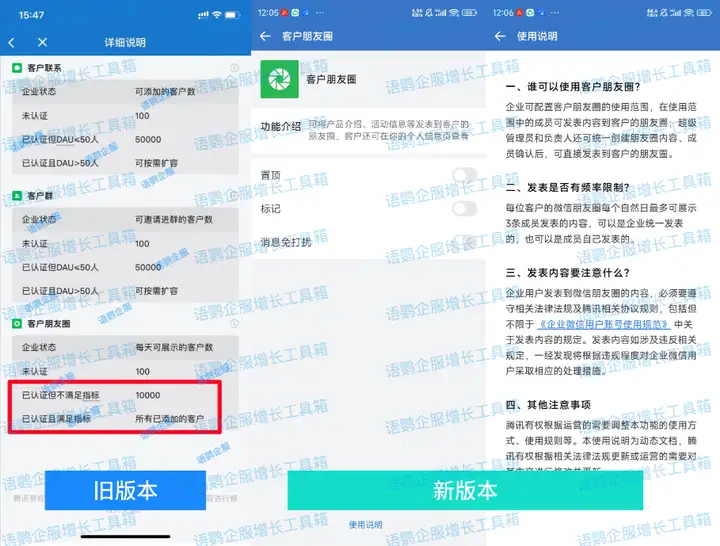 在旧版企业微信中,对于已认证但企业员工每日活跃用户(DAU)少于50人的企业,客户朋友圈的触达数量被限制在最多10000个外部联系人。这一限制在一定程度上限制了小型企业和初创公司的信息传播能力,影响了他们通过企业微信进行大规模客户沟通和营销推广的效果。
