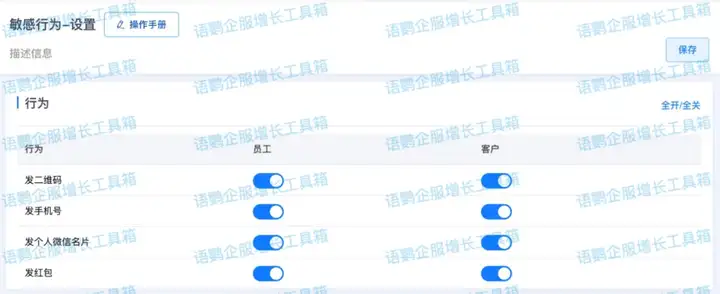 为了进一步提升群聊安全,可以借助语鹦企服的【会话存档与敏感行为监控】功能提供了进一步的防骚扰能力。语鹦企服的会话存档-敏感行为监控功能则可实时监测群聊内容,自动识别发二维码、发手机号、发名片、发红包的行为,确保群聊内容健康合规。