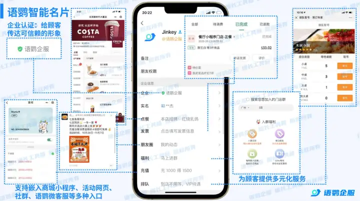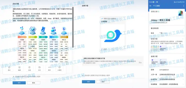不过目前企业设置的企业介绍和业务介绍,仅支持在企业微信端给企业微信好友看到,如果你是做toC的生意,要给个人微信用户看到你的丰富业务介绍,可以借助语鹦名片,给外部联系人展示更多企业信息,比如商城小程序、活动网页、社群入口、微信客服入口、公众号文章等等。