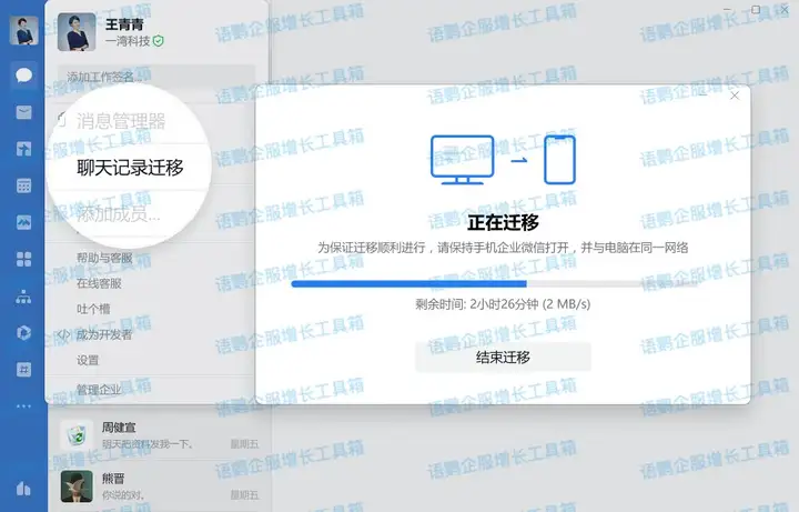 之前Windows客户端和Mac客户端聊天记录是没办法互相迁移的,电脑重装后,聊天记录也会丢失,而在企业微信4.1.26版本中,新增了在同一网络下手机端和电脑端互相迁移聊天记录的功能。
