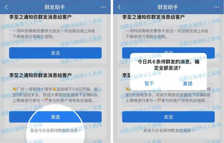 本次企业微信的升级之后,企业可以允许成员一键发送当天所有待发送的消息。这意味着企业可以根据不同的客户群体和业务需求,制定并安排多条不同的消息,在需要时统一发送。这一功能特别适用于需要频繁向不同客户群体推送信息的企业,如营销活动通知、产品更新、客户关怀等。