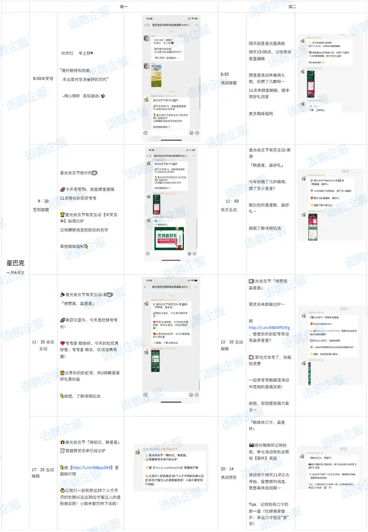 以星巴克月营销日历为例,星巴克可以在语鹦企服工具箱后台,将每日要群发的内容提前规划到营销日历中,系统会根据设定的群发时间,定时自动推送出去,既避免了忘记发送的尴尬,又能通过群发灵活度实现营销效果最大化。